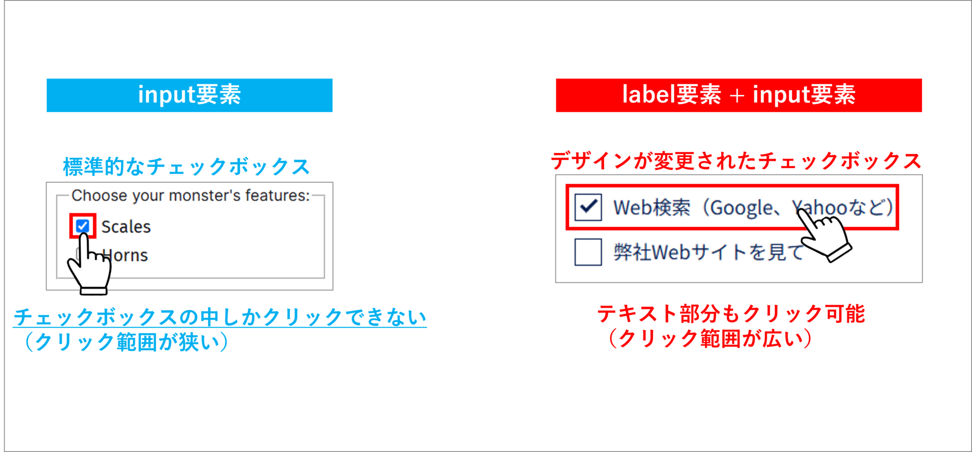 チェックボックスをカスタマイズする理由として、input要素だけで作成した場合よりも、label要素を併用したほうがクリックできる範囲が広がることが理由のひとつです。