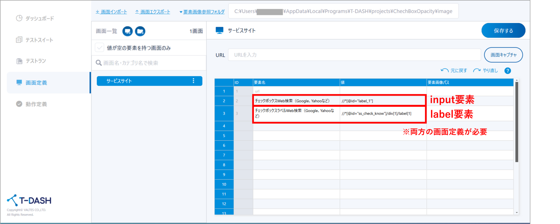 クリックするのはlabel要素ですが、検証対象はinput要素なので両方を画面定義で登録しておきます。