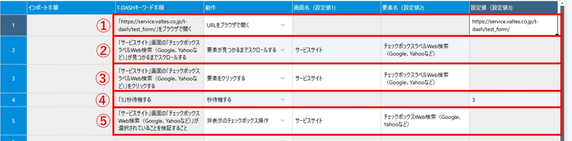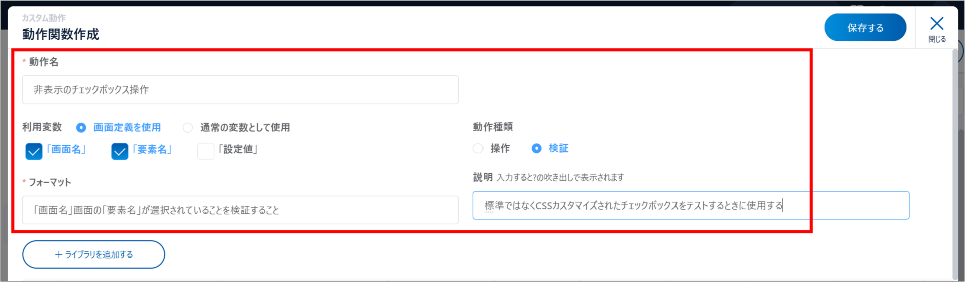 特に②の場合、「チェックボックスが選択状態か検証する」の動作が正しく動作しないことがあるため、その検証を行うカスタム動作を作成します。