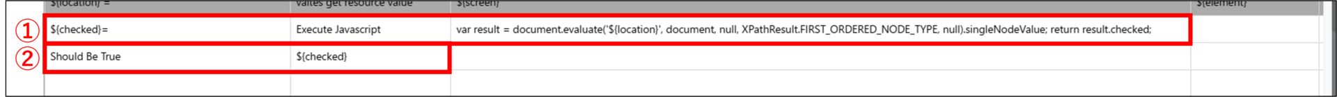 | ① | ${checked}= | Execute Javascript | var result = document.evaluate(‘${location}’, document, null, XPathResult.FIRST_ORDERED_NODE_TYPE, null).singleNodeValue; return result.checked; |