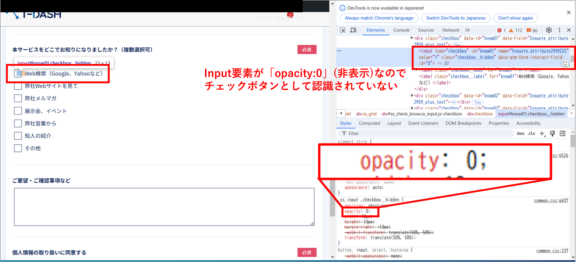 チェックボックスは本来input要素ですが、今回のようにinput要素が非表示になっていて、label要素で切り替えるように実装されたチェックボックスがあります。このような場合label要素で画面定義する必要があります。