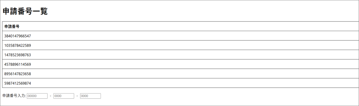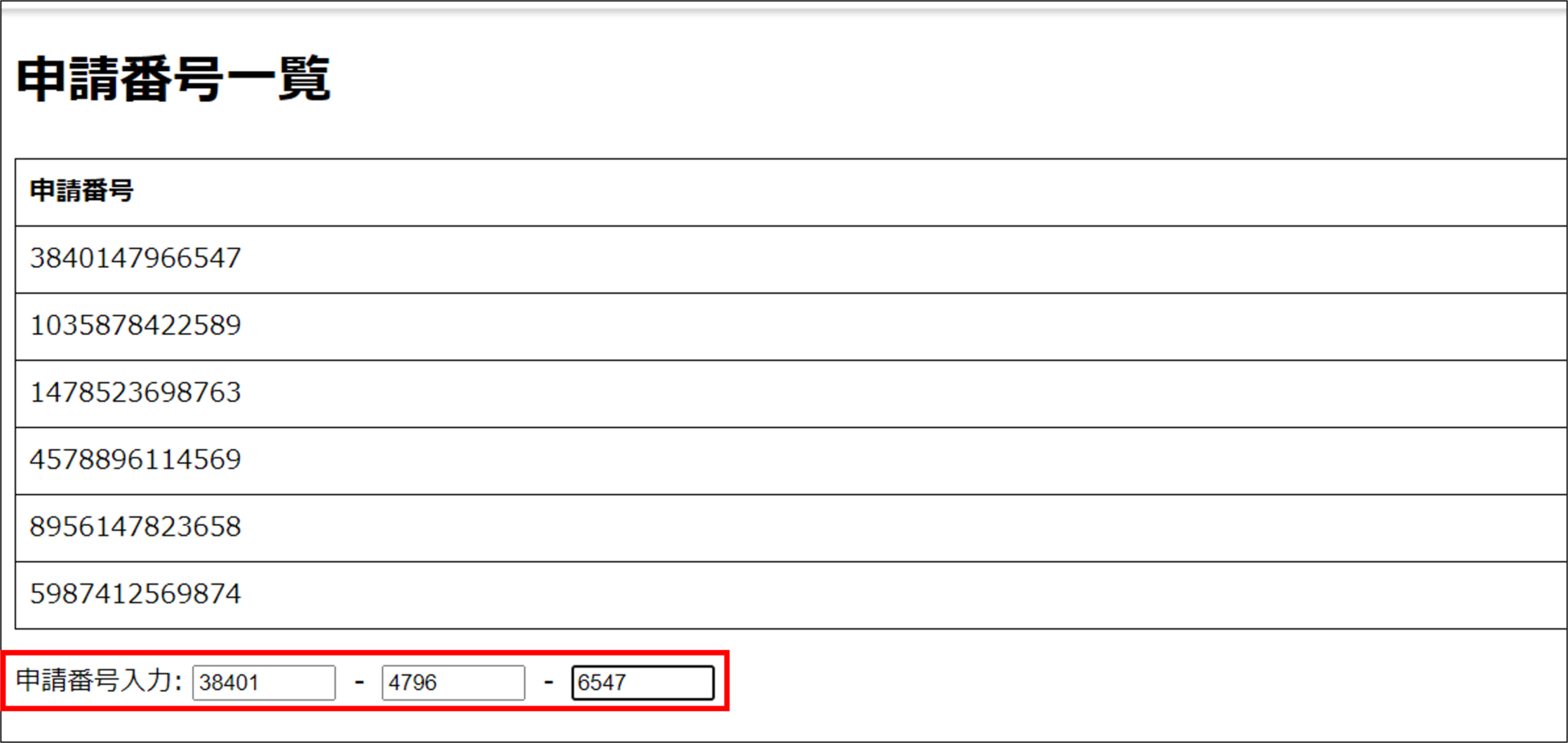 一番上の申請番号(3840147966547)を取得して、「申請番号入力」の欄に出力します。