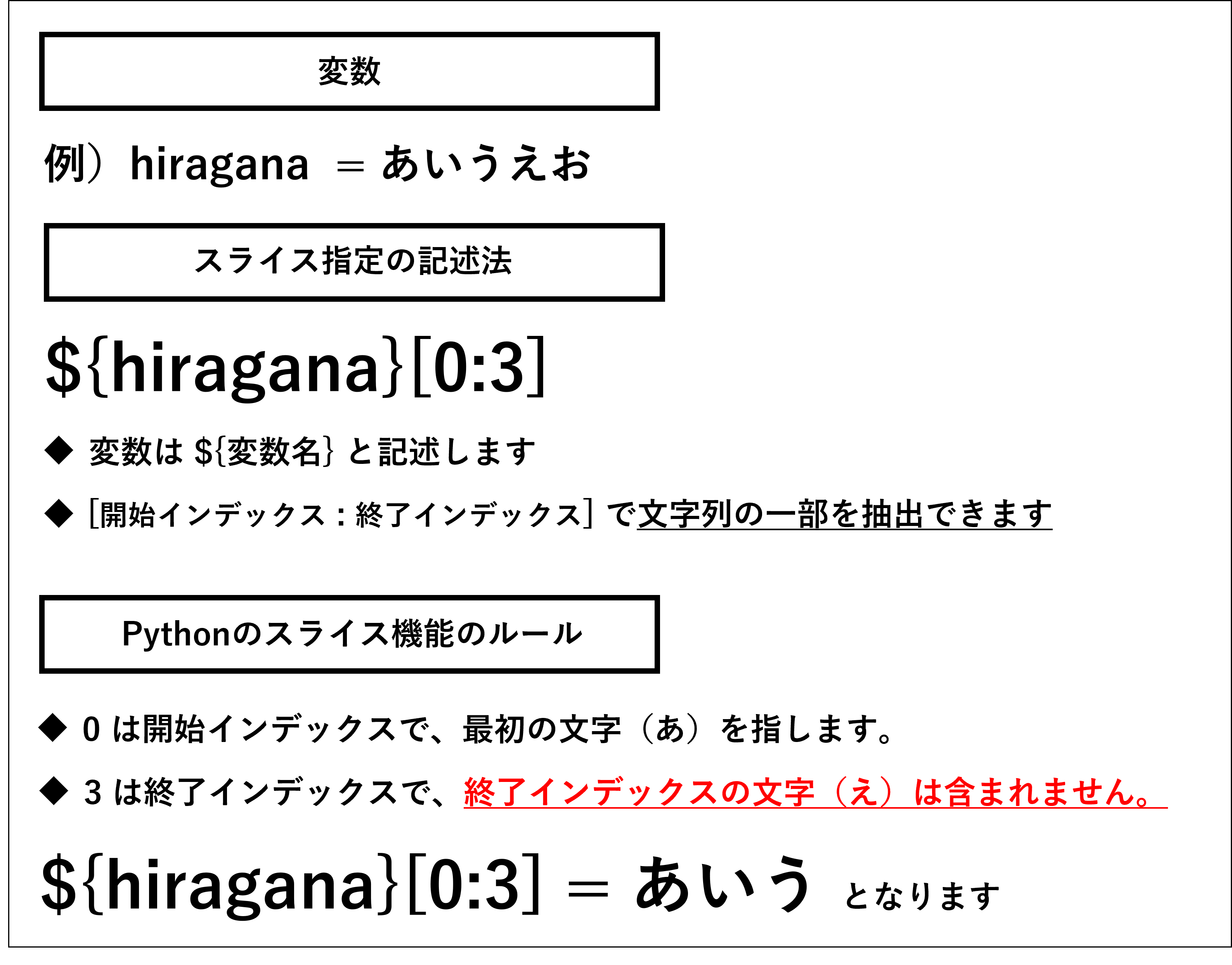 「スライス指定」とは、プログラミングやデータ操作において、インデックスの範囲を指定して部分データを取得する方法です。例えば、「あいうえお」という文字列から、「あいう」だけを取得することをスライス指定といいます。