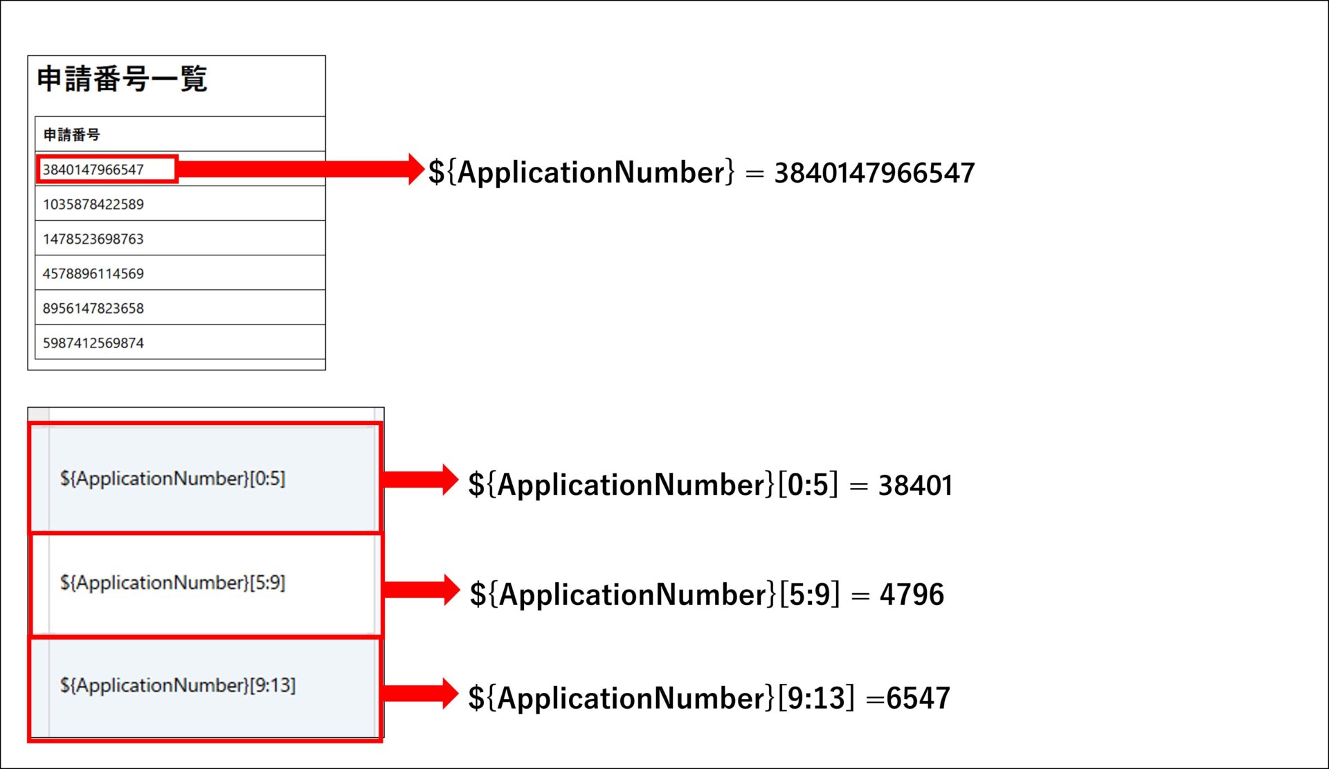 ${ApplicationNumber}[0:5]とはApplicationNumber変数にある文字列の「0番目から4番目」という意味です。