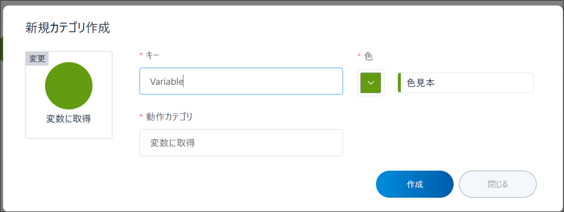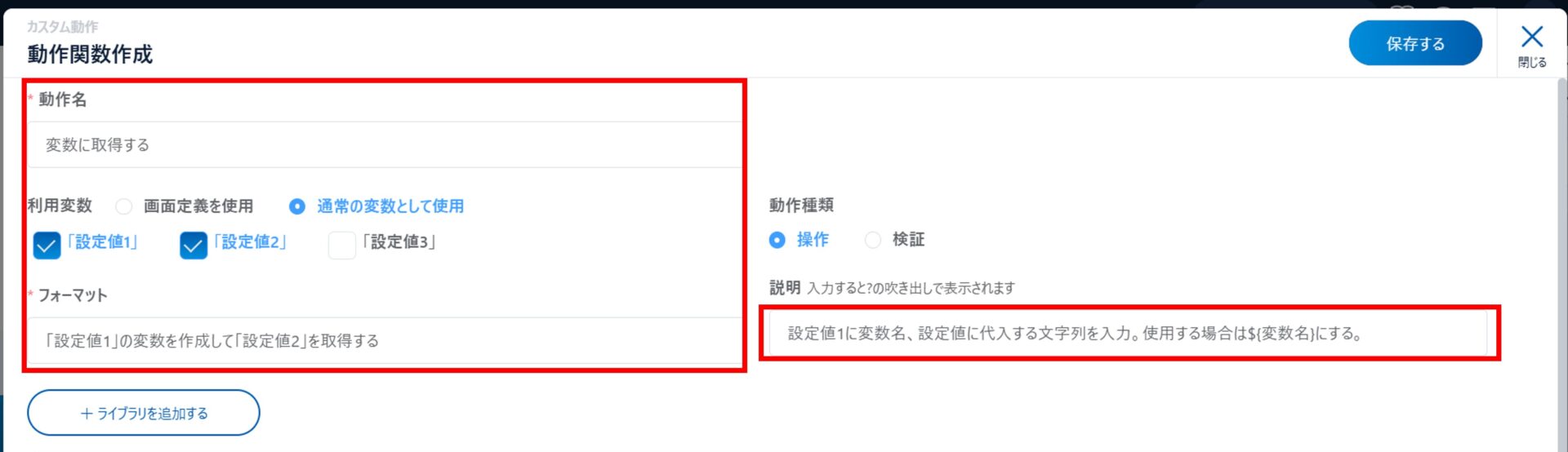 画像のように「任意の動作名」 「利用変数」 「動作種類」 「任意のフォーマット」 「説明」を設定します。