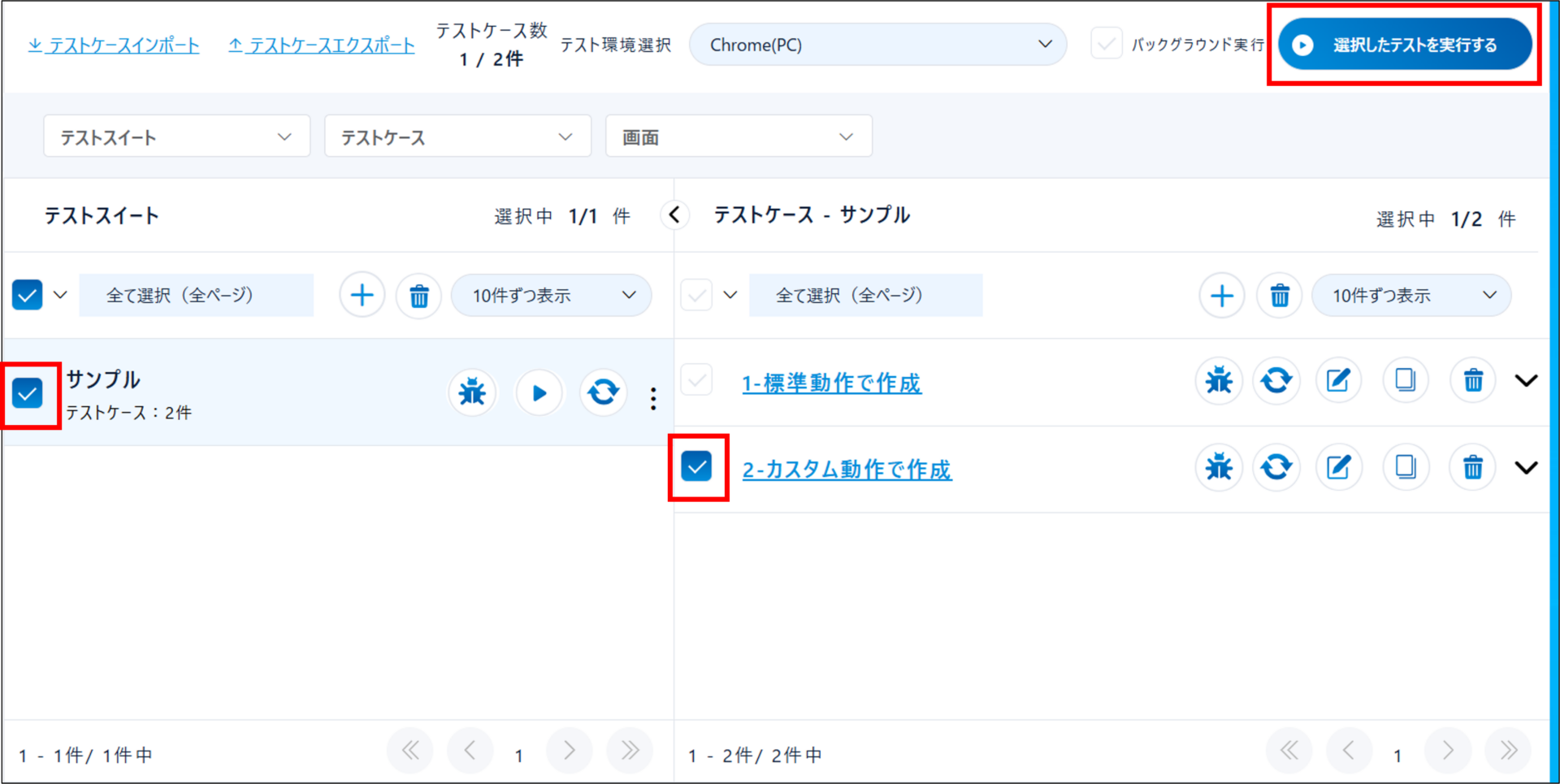 テストケースを保存して、テストを行いたいテストスイートとテストケースにチェックを入れます。