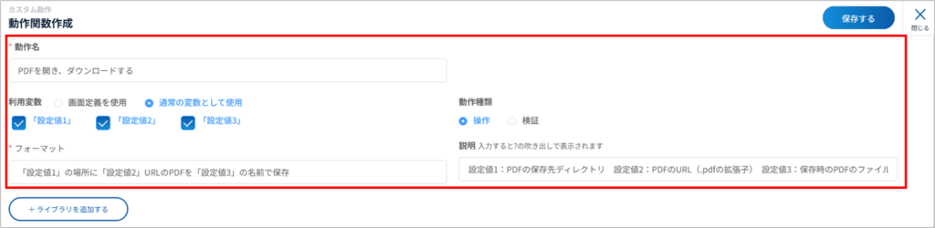 設定値1:PDFの保存先ディレクトリ 設定値2:PDFのURL(.pdfの拡張子) 設定値3:保存時のPDFのファイル名をディレクトリから記載