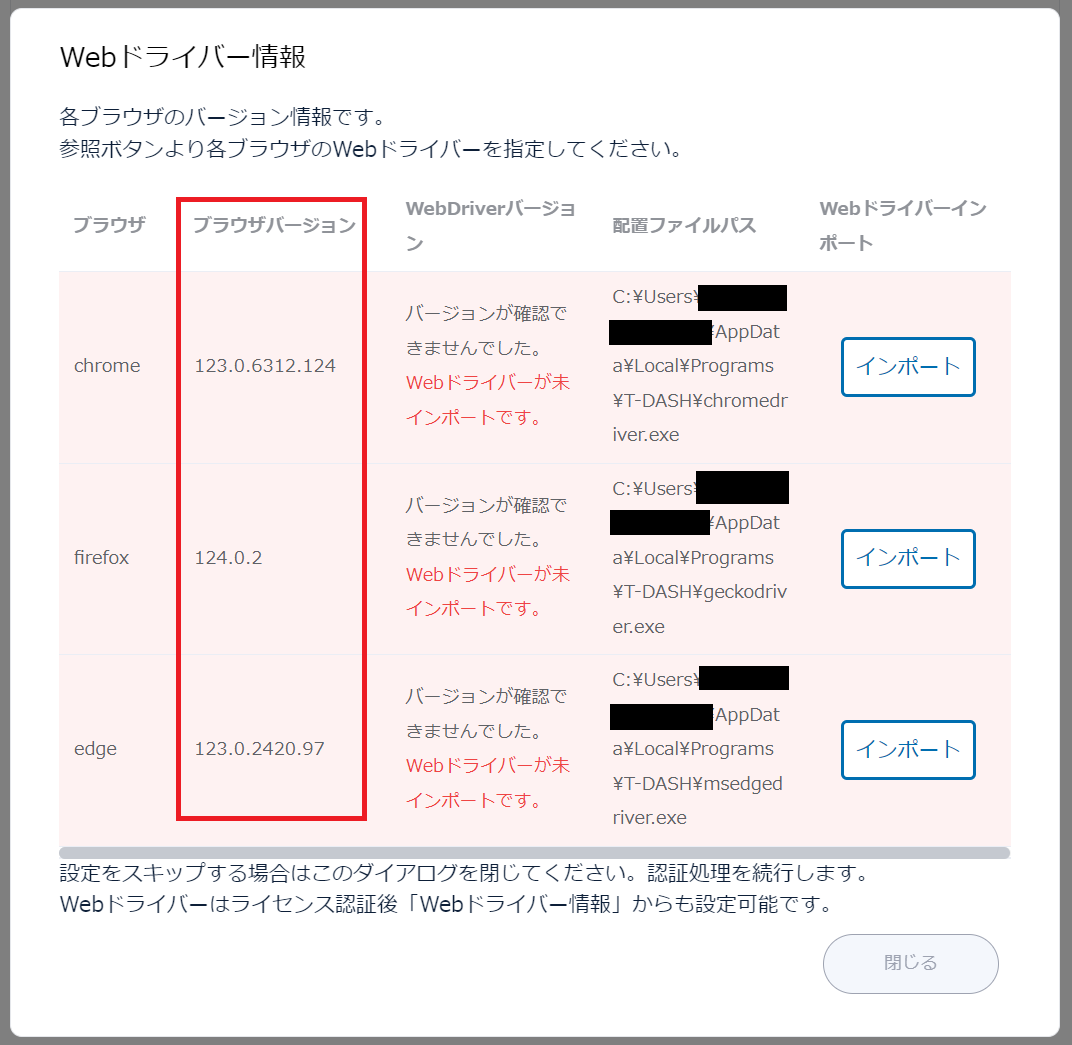 - Webドライバー情報よりお使いのブラウザバージョンをご確認ください。