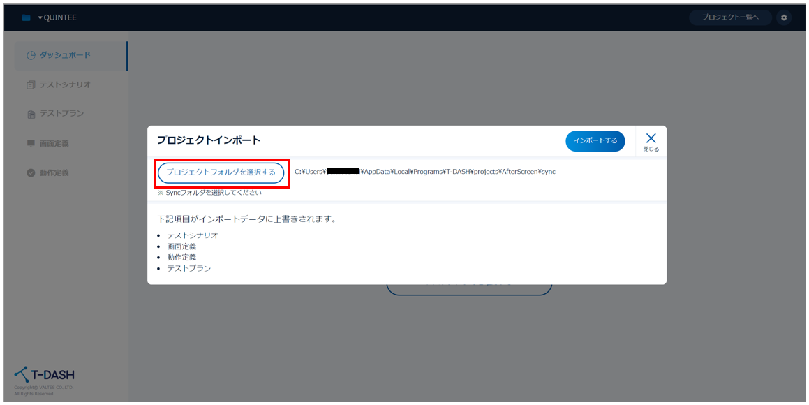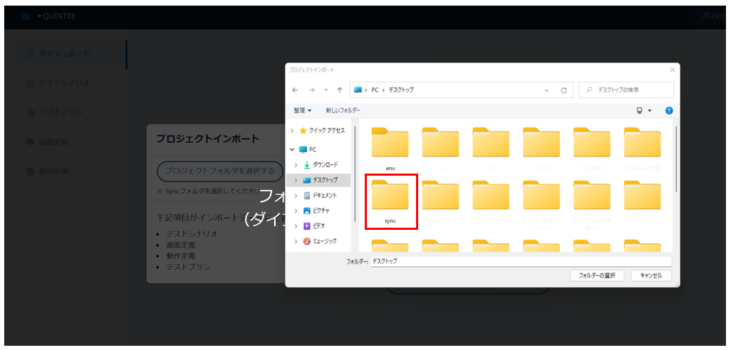 - ファイル選択ダイアログにて、手順1で取得したプロジェクトファイル(Syncフォルダ) を選択する