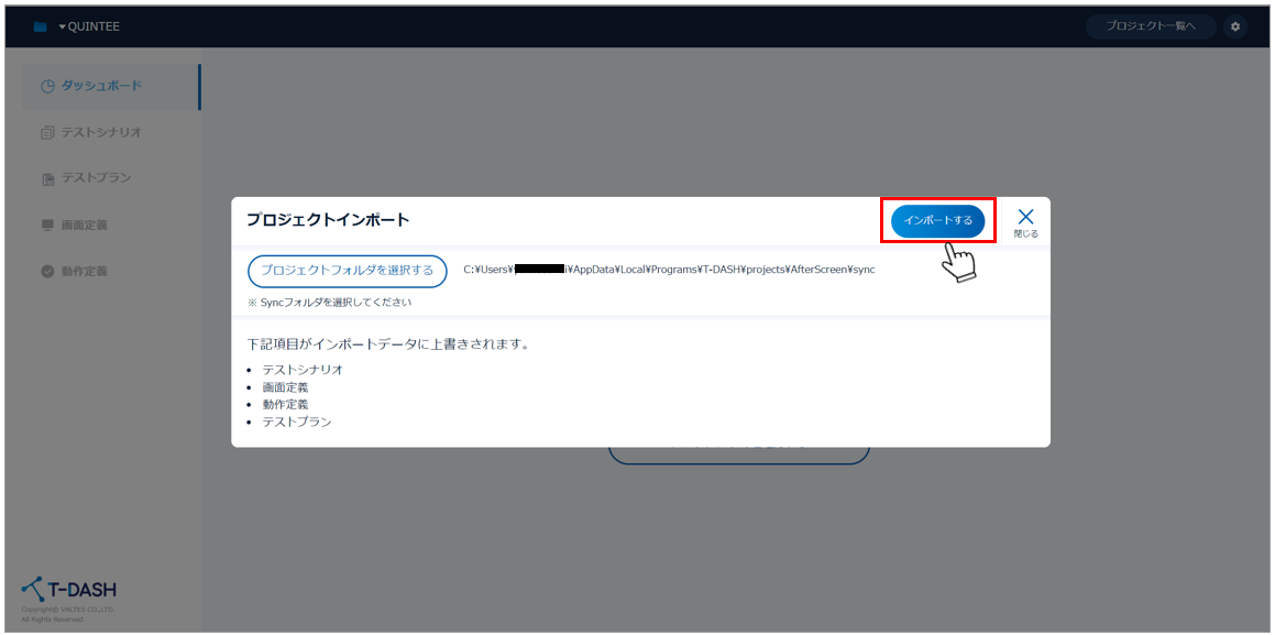 Syncフォルダを上書きし、インポートすると、プロジェクト内容が置き換わります。