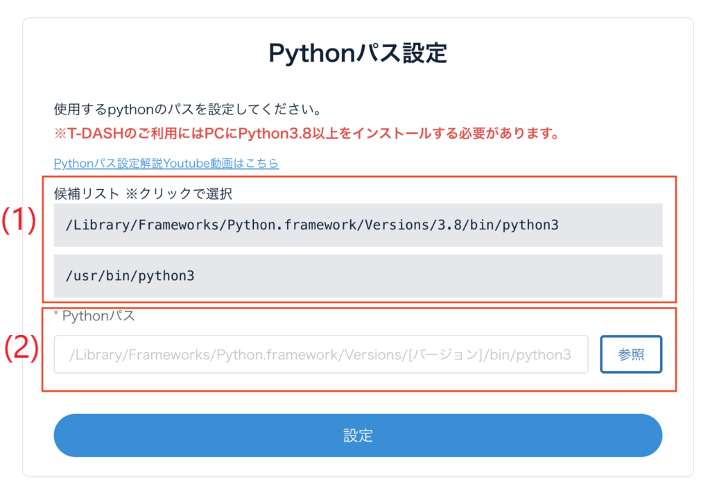 | (1)Pythonパス候補 | Pythonがインストールされている場所の候補が表示されます。 クリックして選択してください。 |