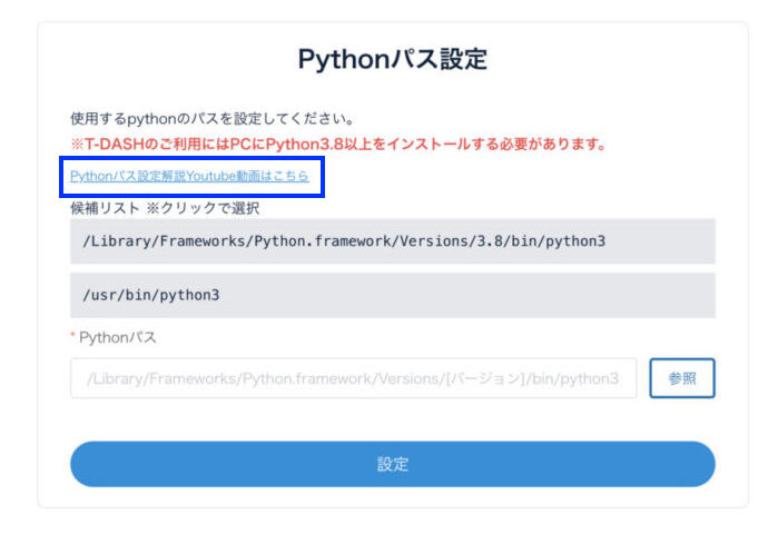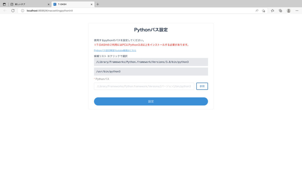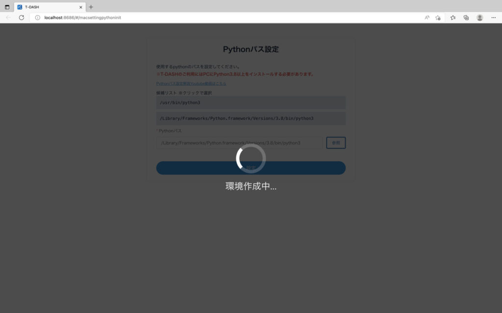 macOSにてT-DASHの初回起動時に「Python」の設定が必要です。