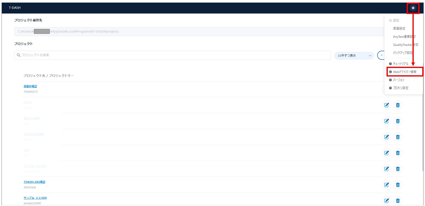 T-DASHでは、テスト実行に使用するブラウザとWebドライバーのバージョンを確認することができます。