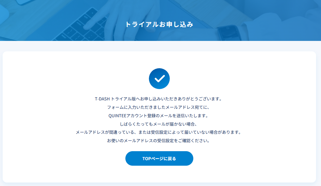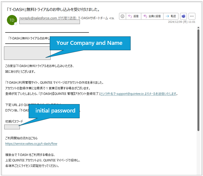 First Mail (Subject) : 「T-DASH」無料トライアルのお申し込みを受け付けました。