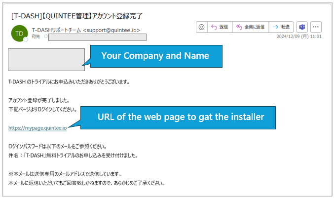 Second Mail (Subject) : [T-DASH]【QUINTEE管理】アカウント登録完了