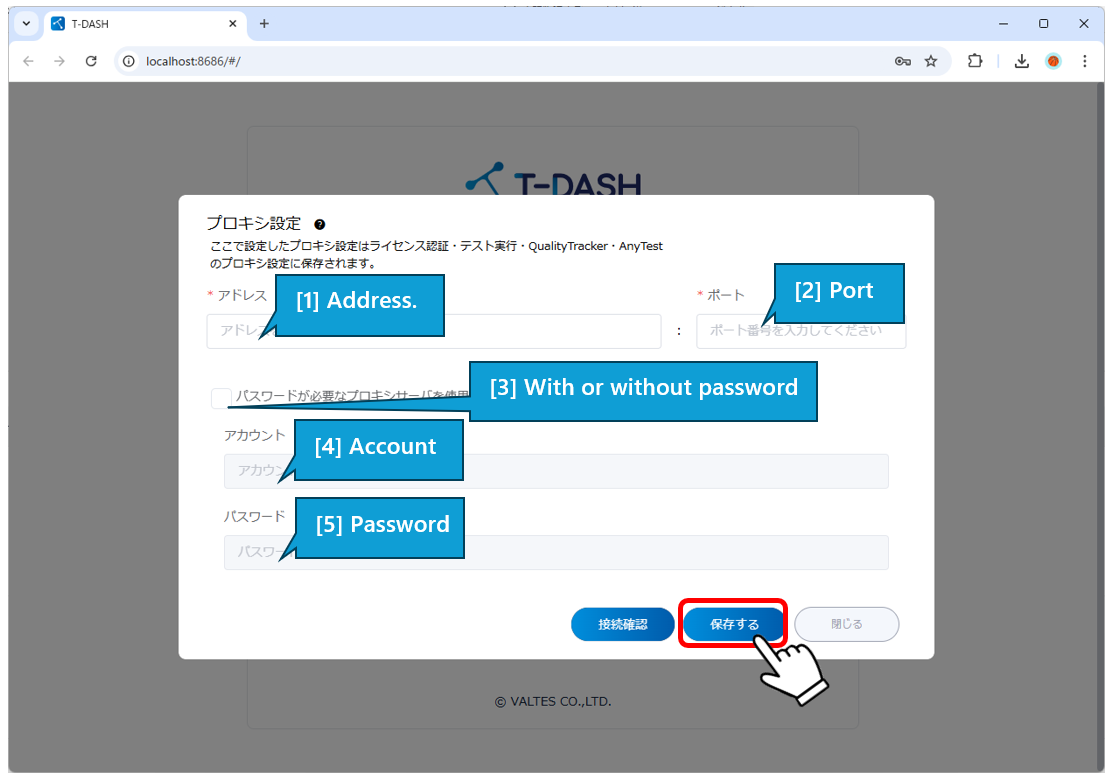 | [5] Password | [Needed if the checkbox in [3] is checked.] Enter the Password of the proxy server |