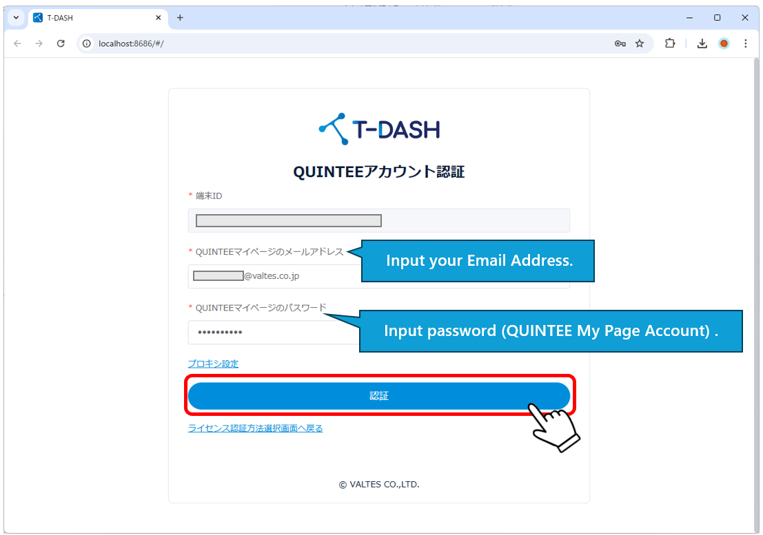 3-3. On the authentication screen, enter the email address and password for your QUINTEE My Page account and click the authentication button.