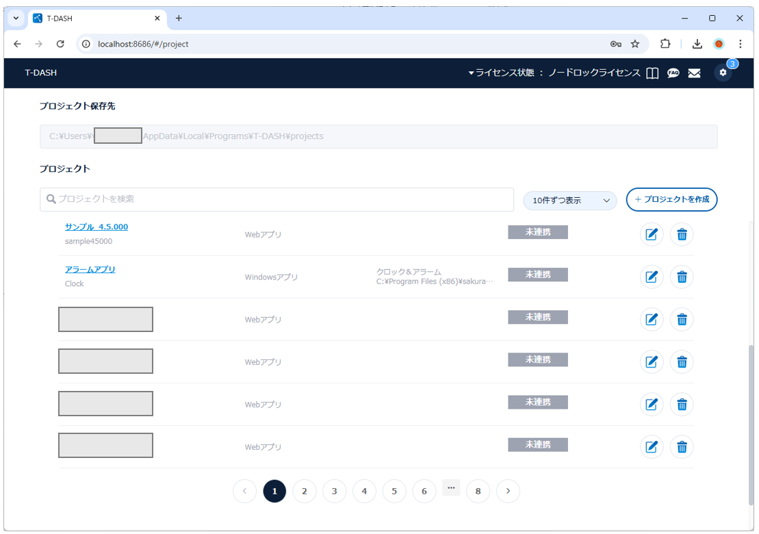 3-5. T-DASH will start and the project list screen (initial display screen after startup) will appear.