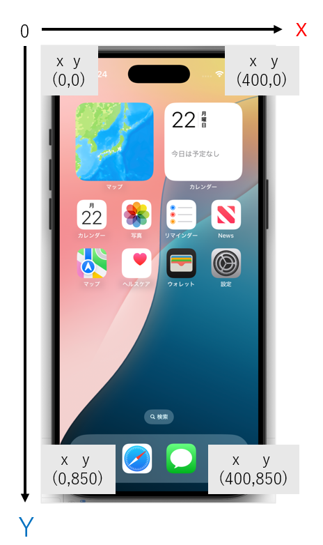・端末によって画面サイズが異なるため、座標の範囲(最小値・最大値)も端末ごとに異なります。