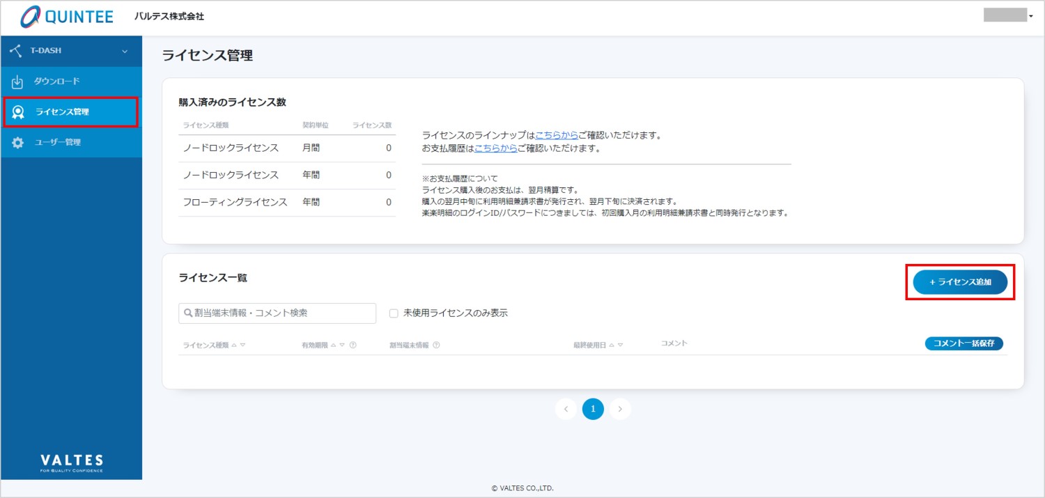 T-DASHは、起動時にライセンス認証して利用するテスト自動実行ツールです。ライセンスの管理はQUINTEEマイページで行います。