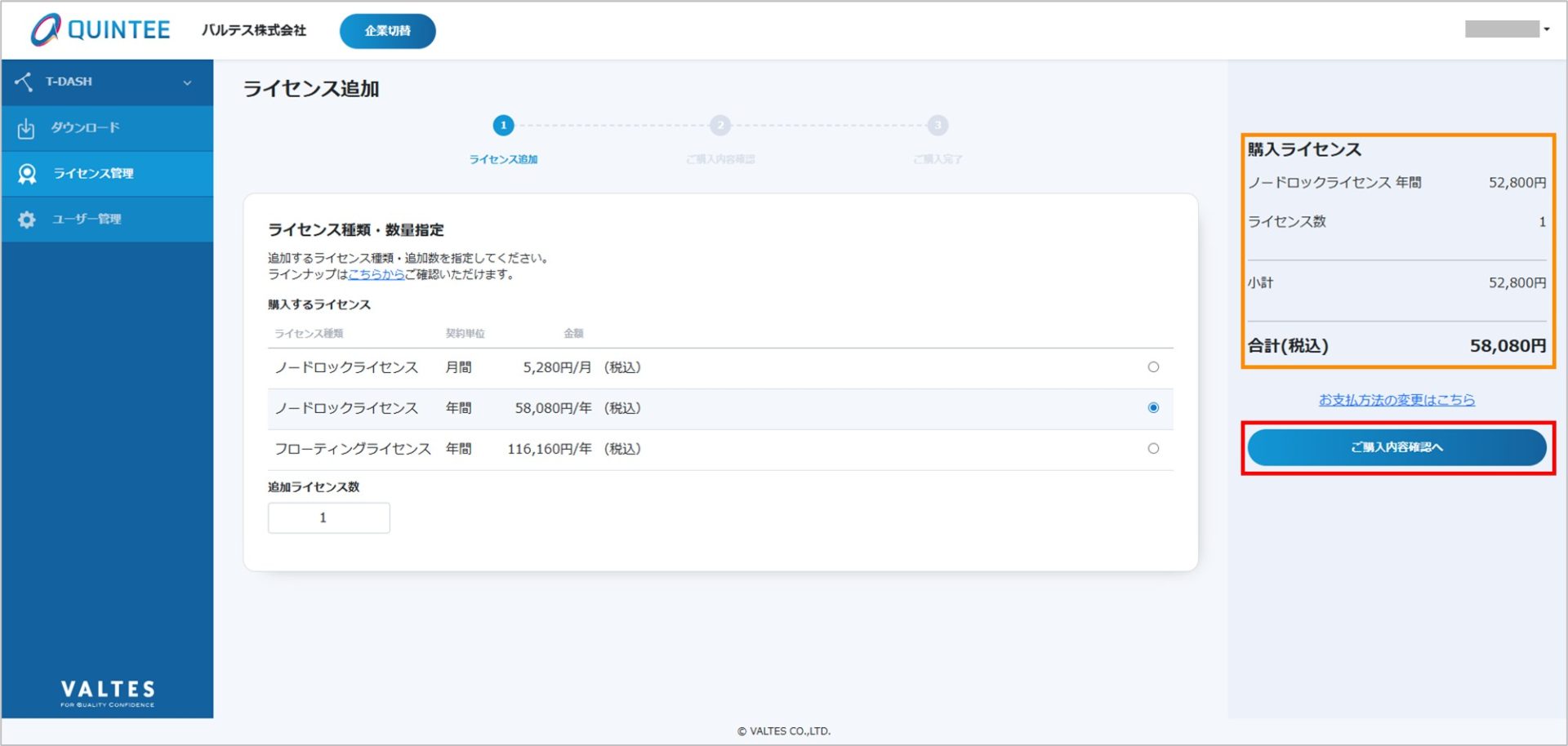 4.(右の購入ライセンス数にて)ライセンス数、金額を確認して「ご購入内容確認へ」ボタンをクリックする