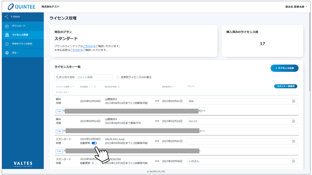 T-DASHは、起動時にライセンス認証して利用するテスト自動実行ツールです。ライセンスの管理はQUINTEEマイページで行います。
