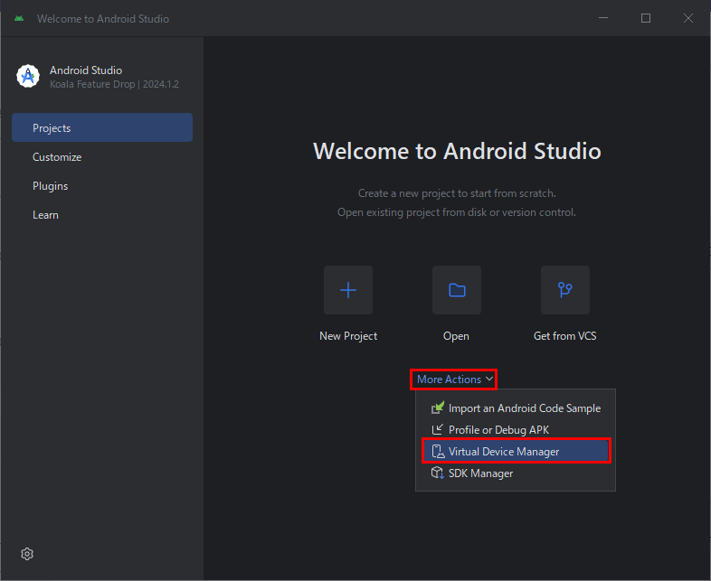 1. AndroidStudioを起動するとWelcomeダイアログが表示されるため、「More Actions」→「Virtual Device Manager」とクリックする。