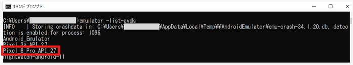 2.下記コマンドでエミュレーターの一覧を取得emulator -list-avds