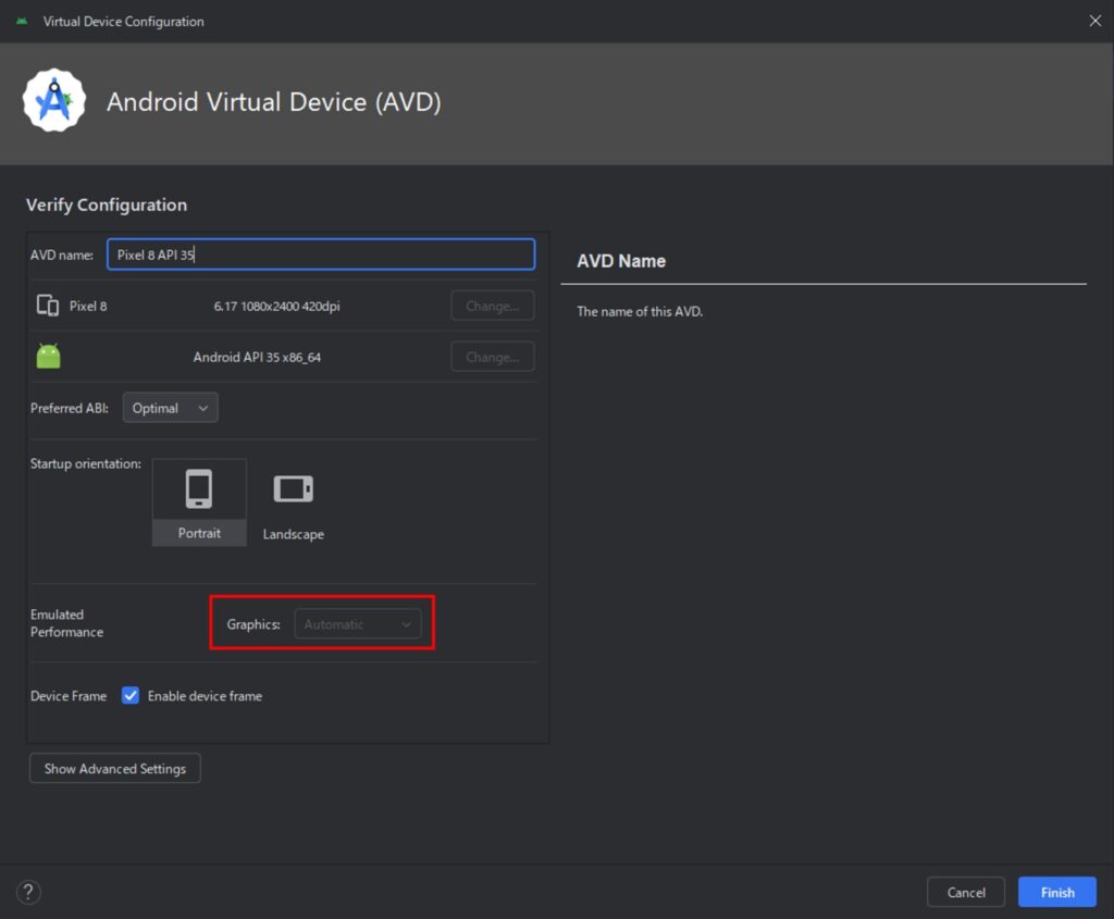 ※エミュレーターが起動しない場合は、端末情報のGraphics設定をご確認ください。