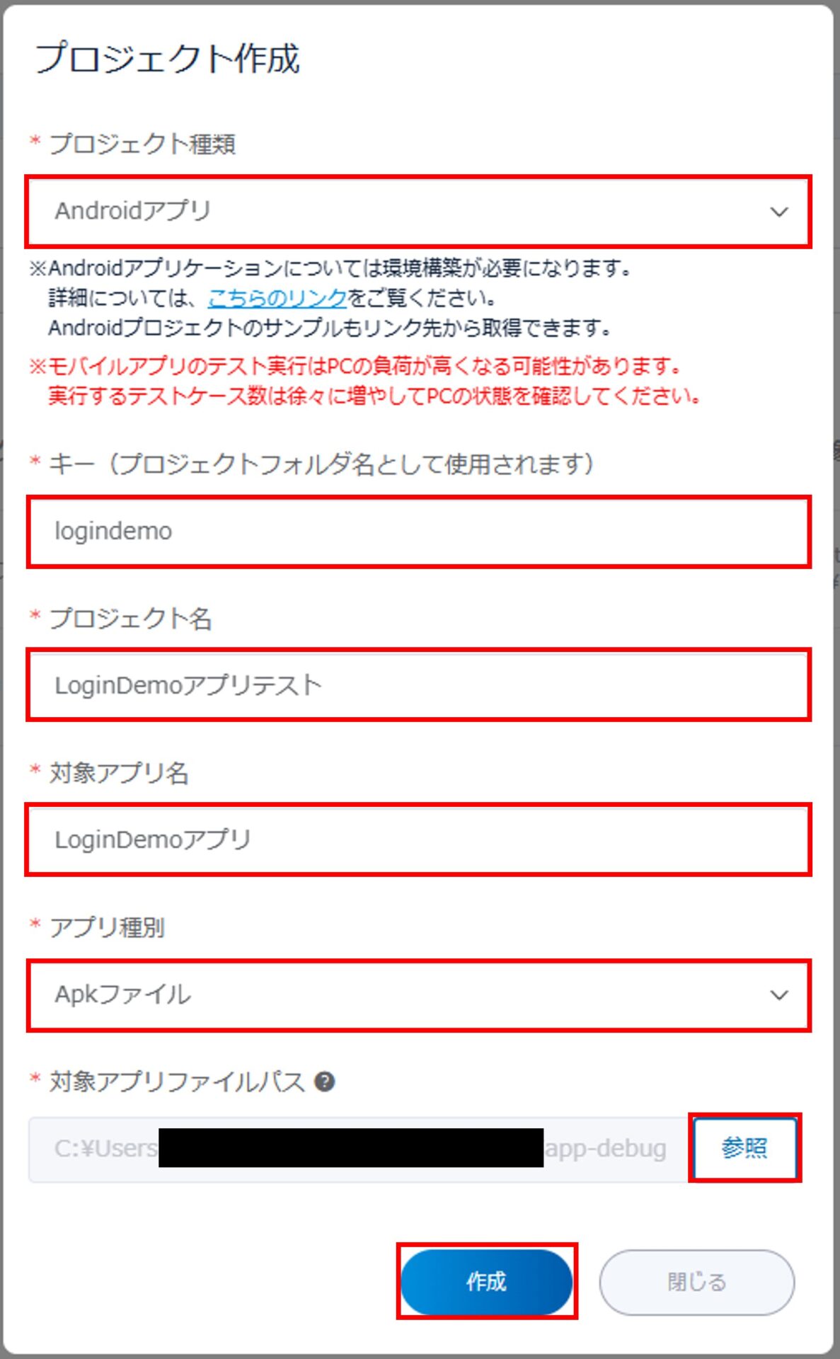 3.2. プロジェクト作成画面にて、以下内容を入力し「作成」ボタンをクリックする。