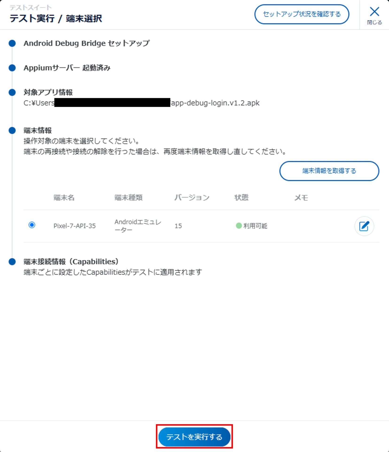6.2. 「端末を選択してテスト実行する」ボタンをクリックする。