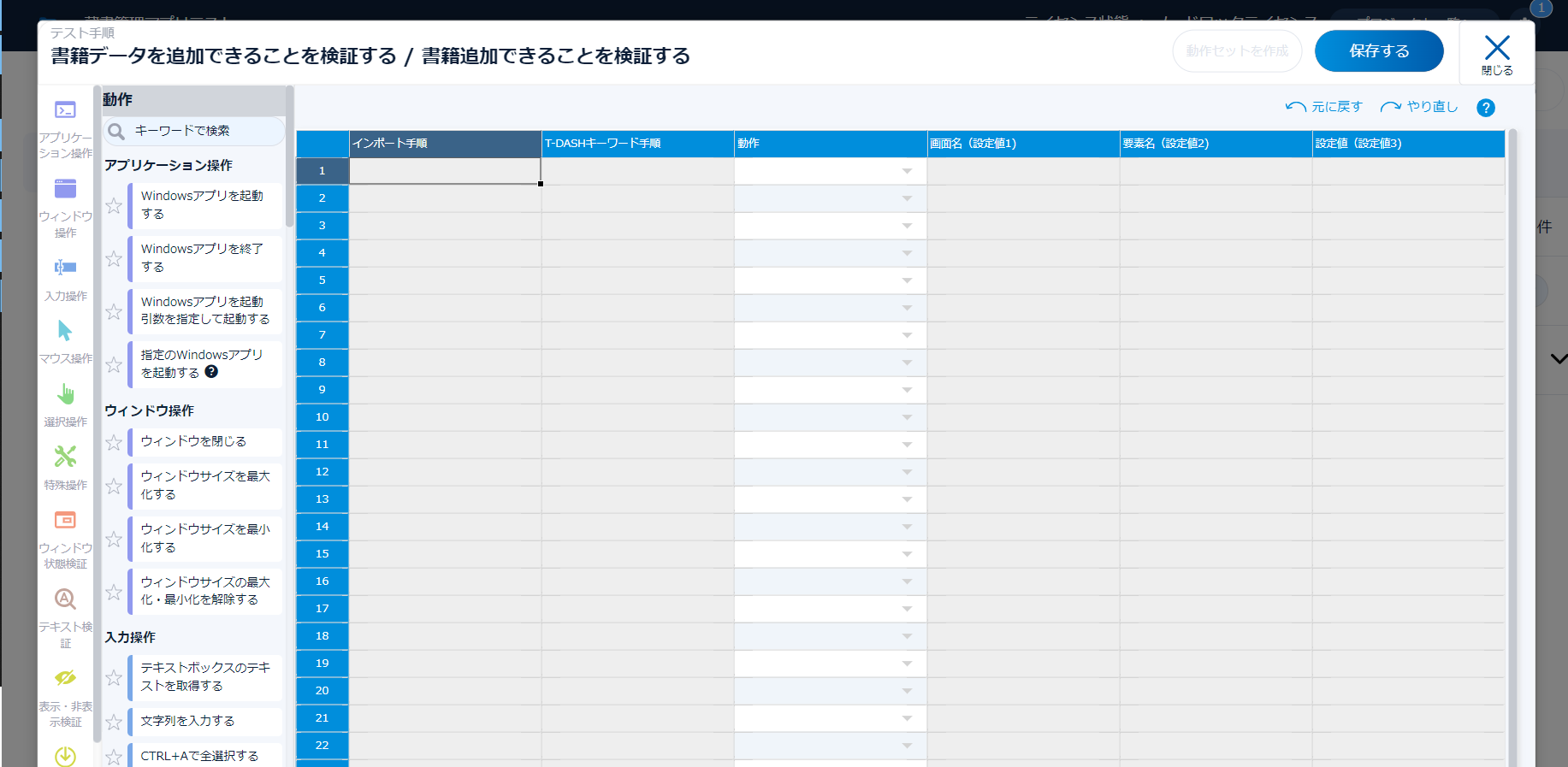 6.6. テスト手順画面にて、「動作」「画面名(設定値1)」「要素名(設定値2)」「設定値(設定値3)」を入力する。