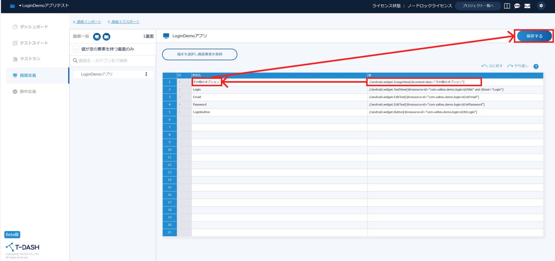 5.8.T-DASHの画面定義を開き、コピーしたXPathを値の欄にぺースト。任意の要素名を入力して、「保存する」ボタンをクリックし登録する。