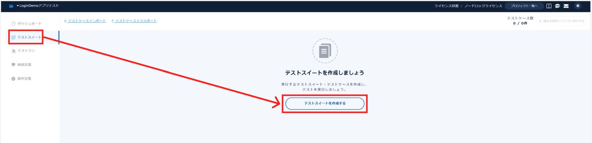 6.1.サイドメニューからテストスイートを選択、「テストスイートを作成する」ボタンをクリックする。