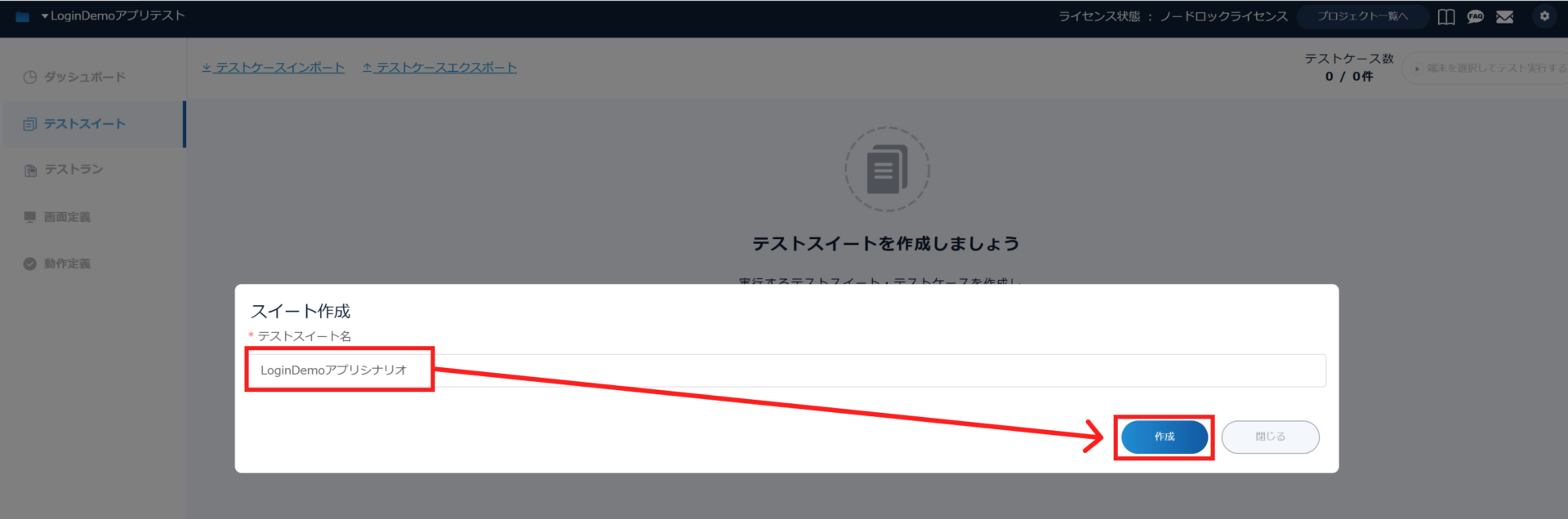 6.2.任意のテストスイート名を入力し、作成ボタンをクリックする。