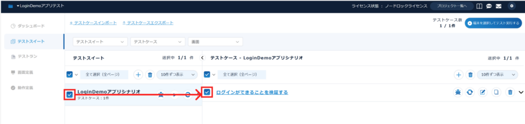 7.1. サイドメニューから、テストスイートをクリックし、実行したいテストスイート名、テストケース名の左にあるチェックボックスをONにする。