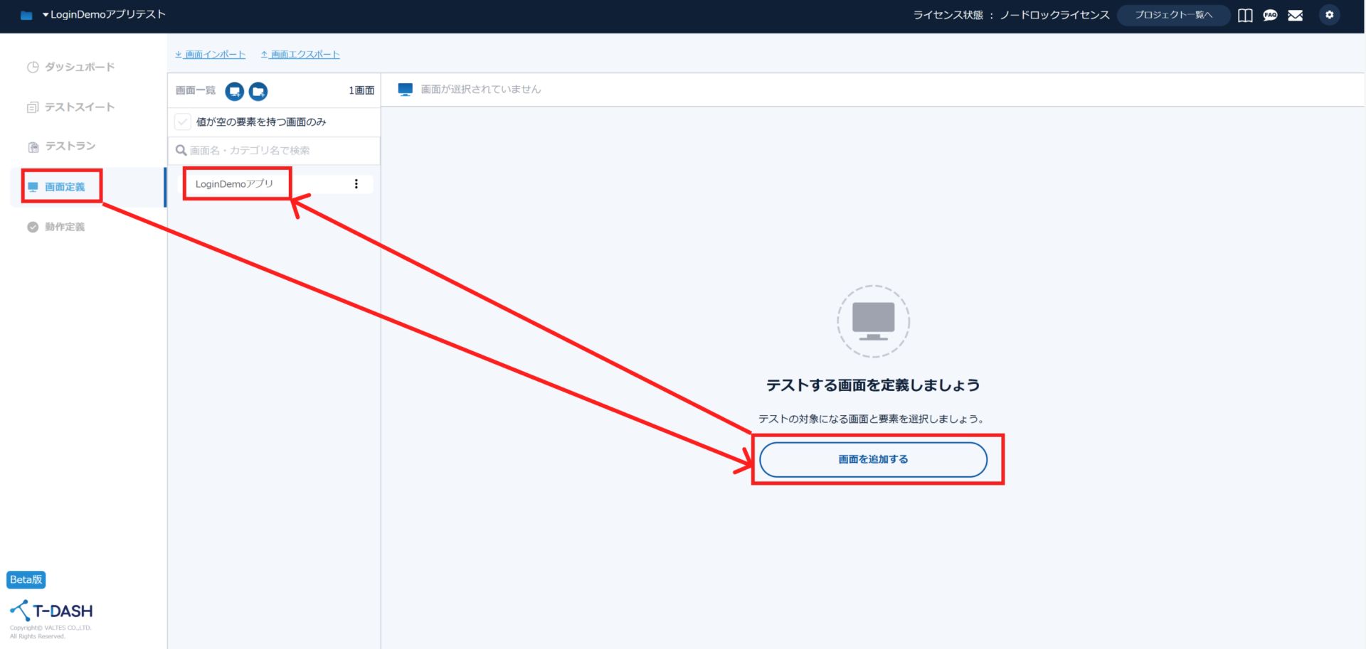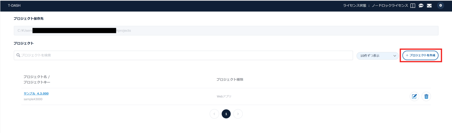 4.1. T-DASHを起動し、プロジェクト一覧画面で「プロジェクトを作成」ボタンをクリックする。