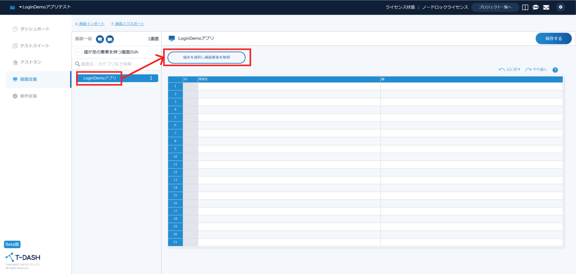 5.2.登録した画面名を選択、「端末を選択し画面要素を取得」ボタンをクリック。