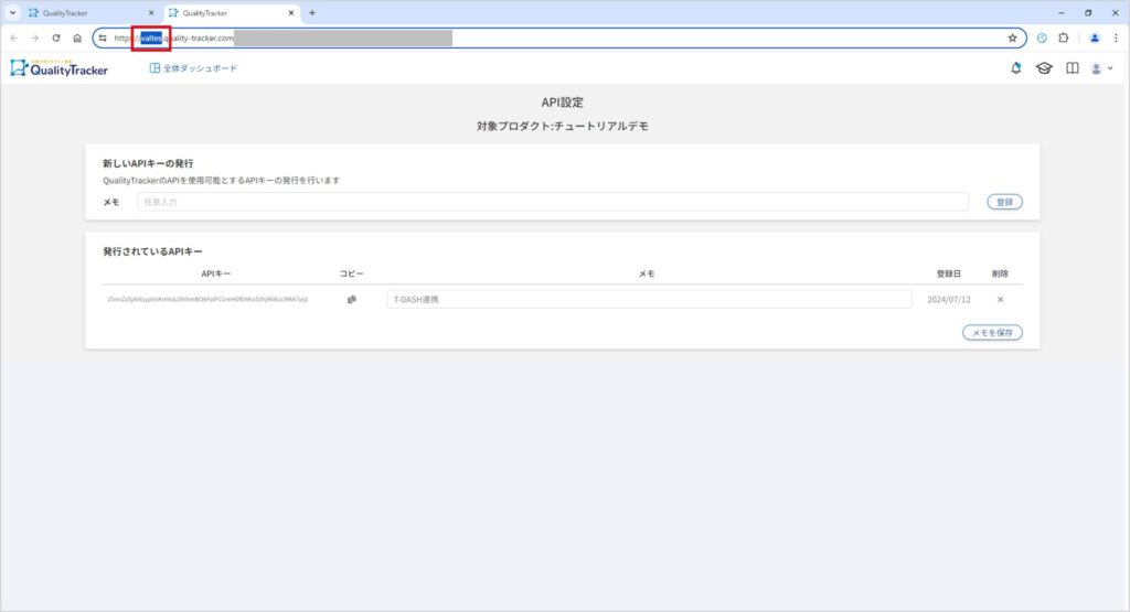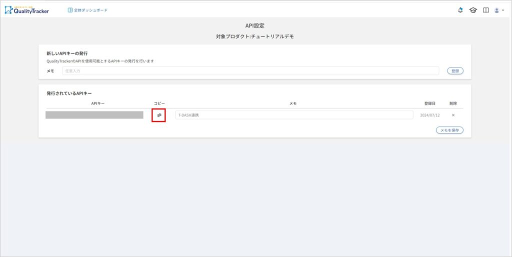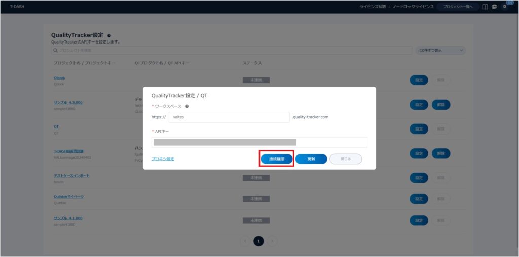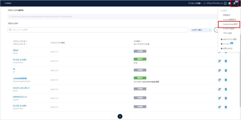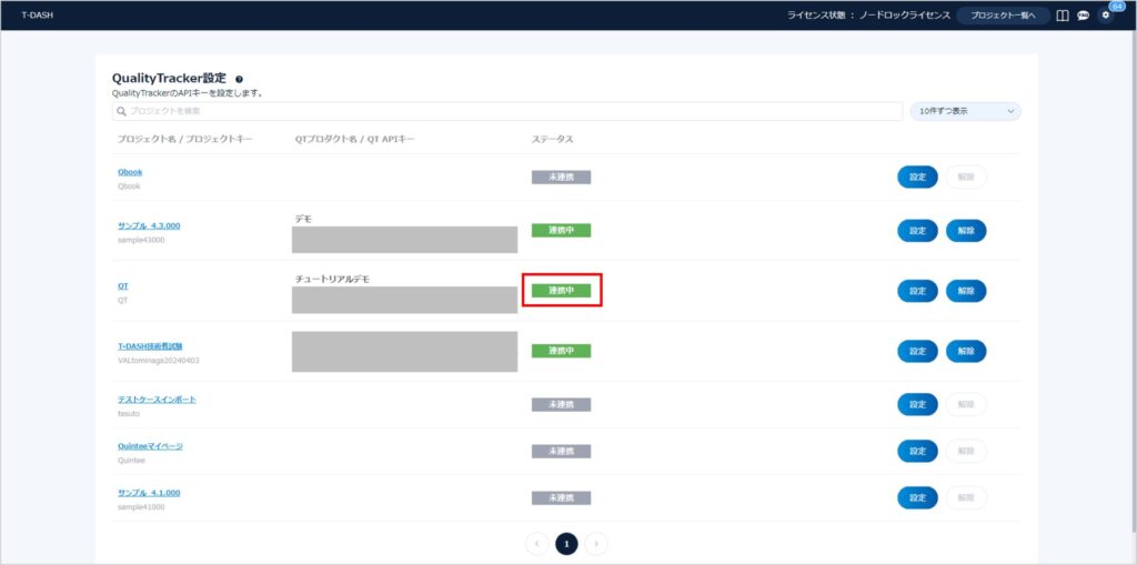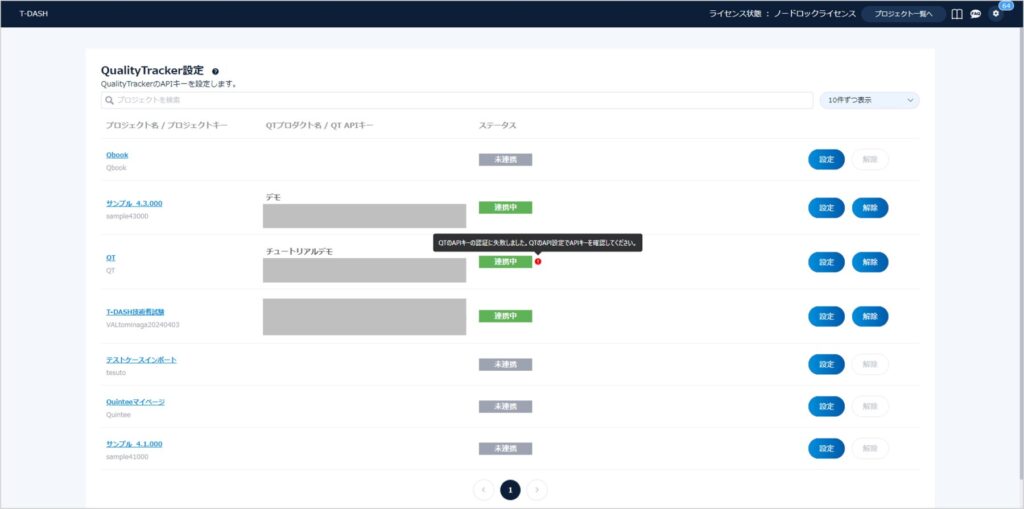 T-DASHで連携済みのAPIキーがQT側で削除された場合、T-DASHのプロジェクト一覧およびQualityTracker設定画面のQT連携ステータスラベルの右側に「!アイコン」が表示されます。