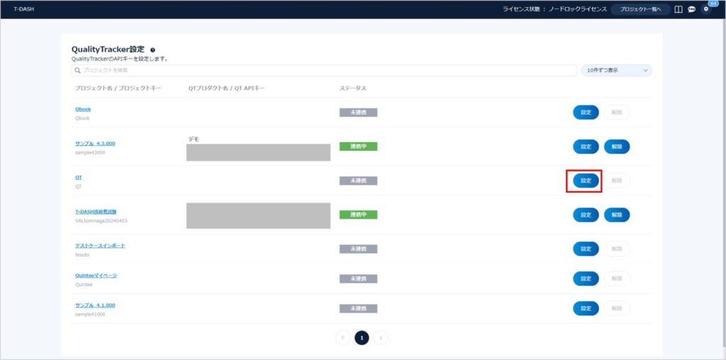 QualityTracker設定画面にて、連携させたいプロジェクトの設定するボタンをクリックします。