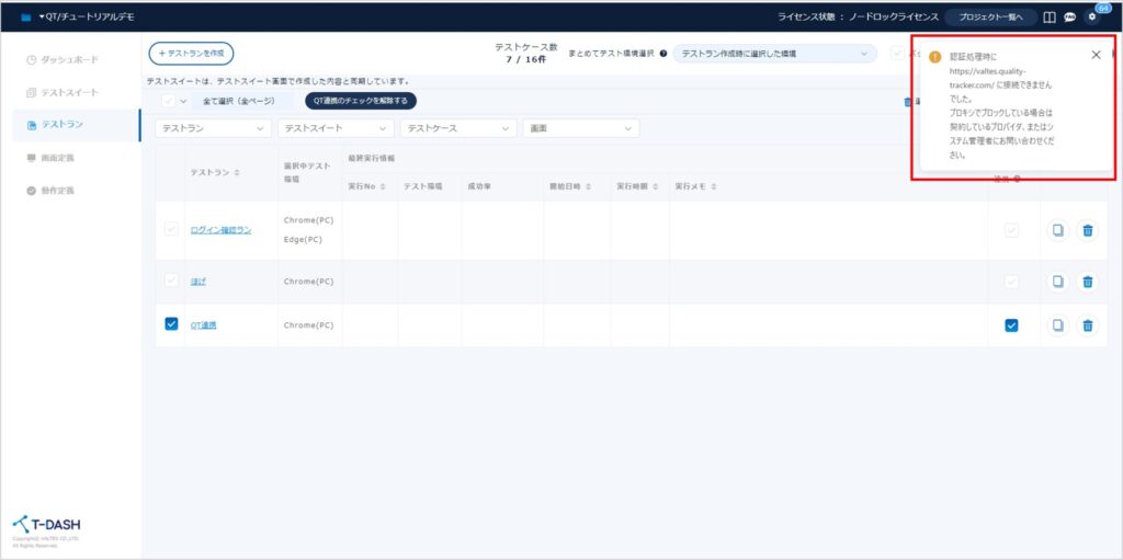 連携が失敗している状態でテストランの実行を試みると、右上にエラーメッセージ「QTのAPIキーの認証に失敗しました。QTのAPI設定でAPI設定でAPIキーを確認してください。」が表示されます。