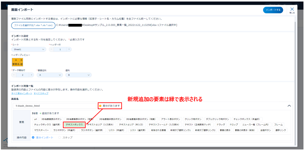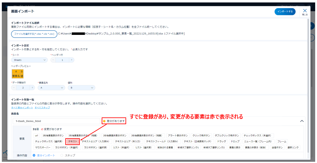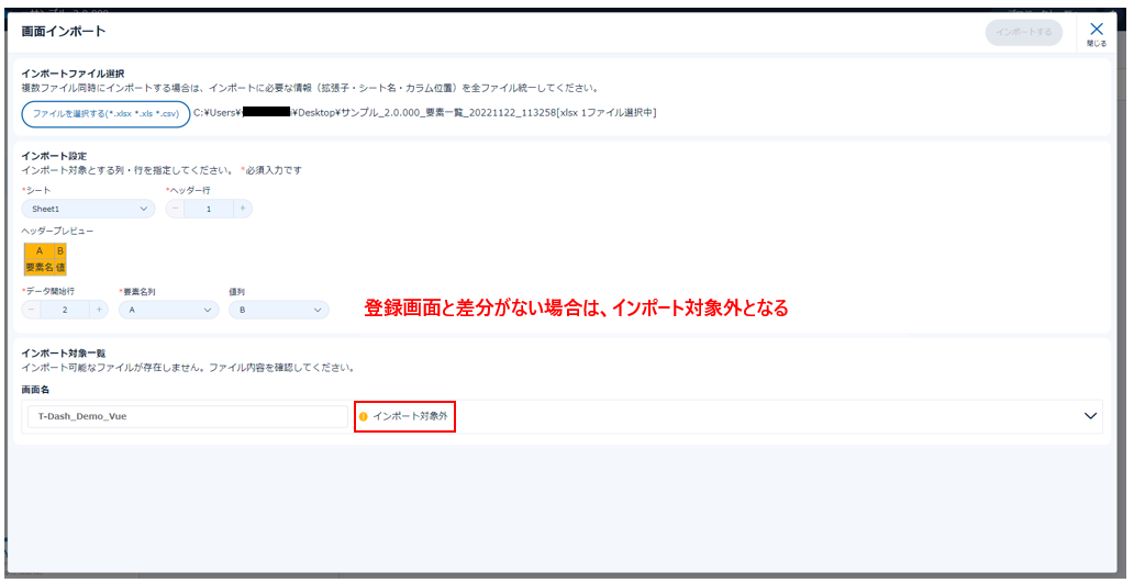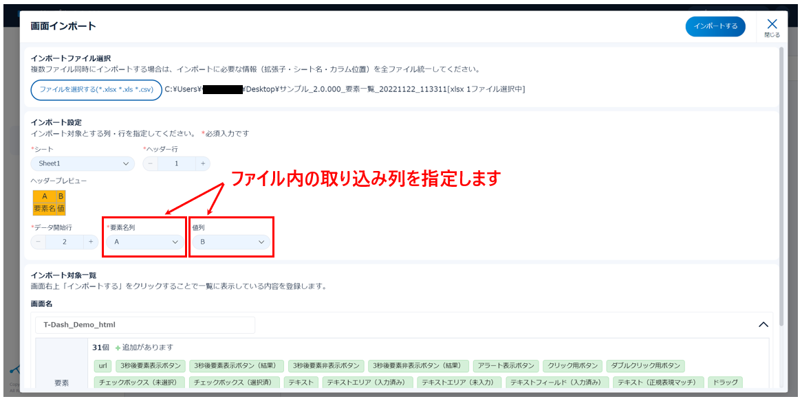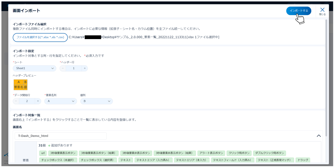 - 画面インポート画面にて、選択したファイルの紐づけを行います