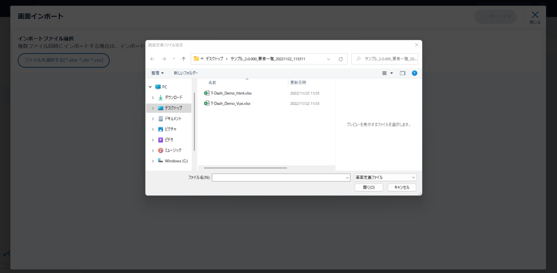 - ファイル選択ダイアログにて、インポートファイルを選択します