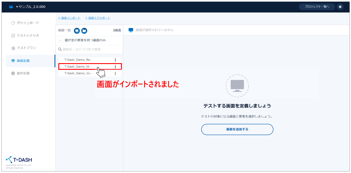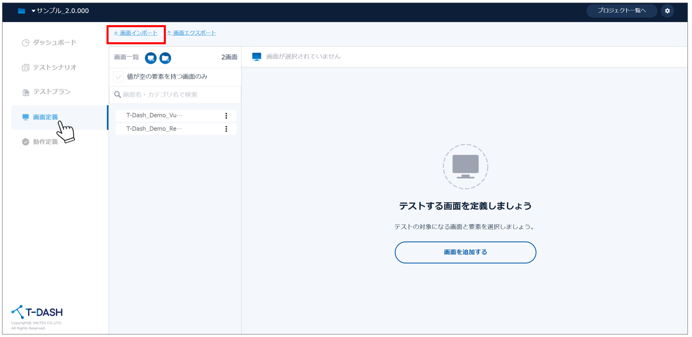 - サイドメニューから画面定義を選択、「画面インポート」をクリックします