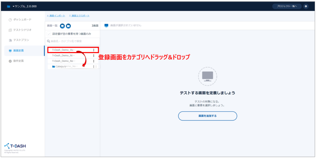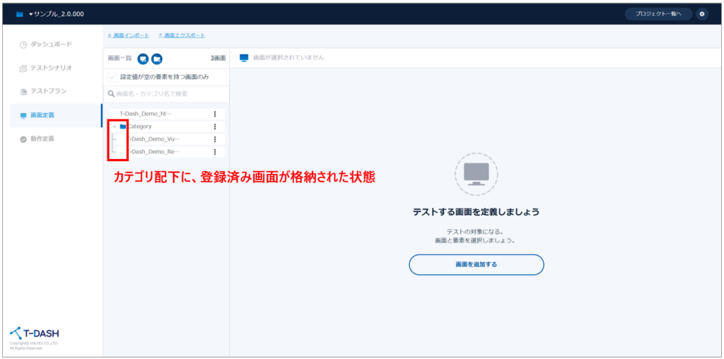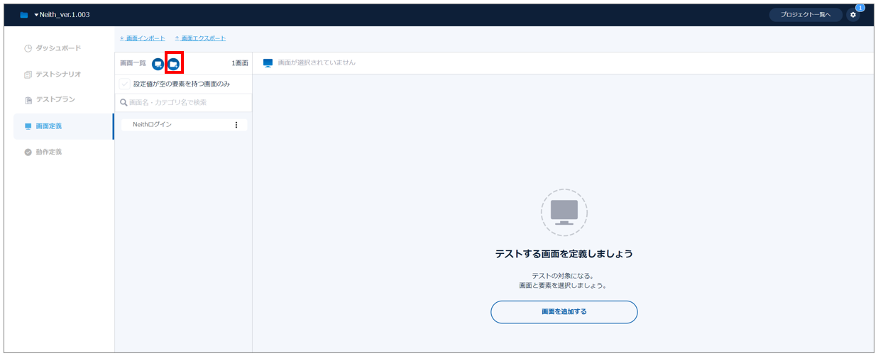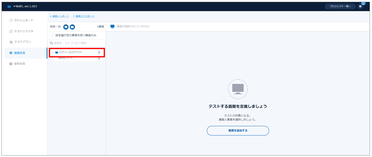 「画面定義」画面では、初めにテスト対象の画面を任意の名称で追加します。また、必要であればカテゴリーを追加して画面の分類も可能となります。