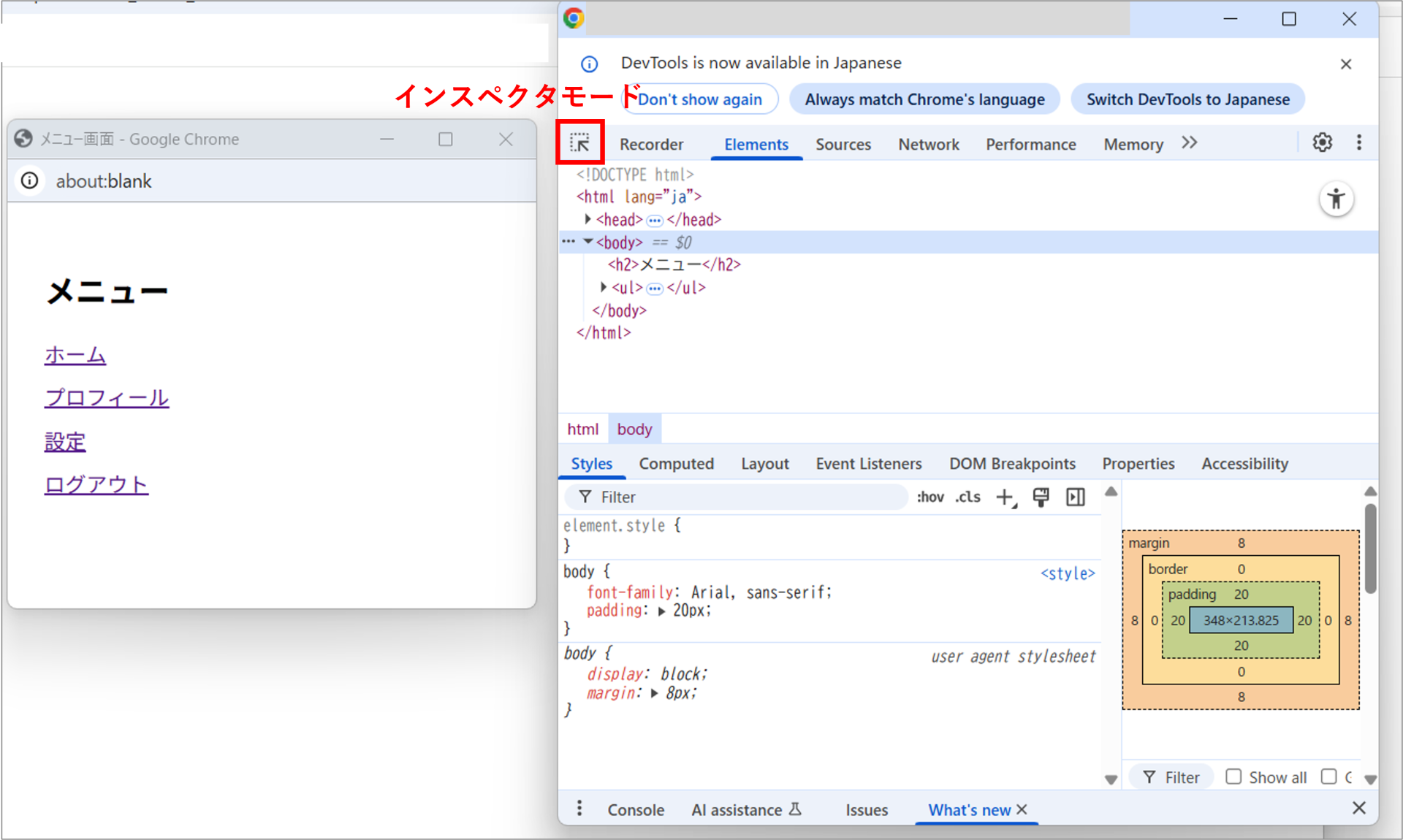 アイコンをクリックして「インスペクタ モード」を起動します。