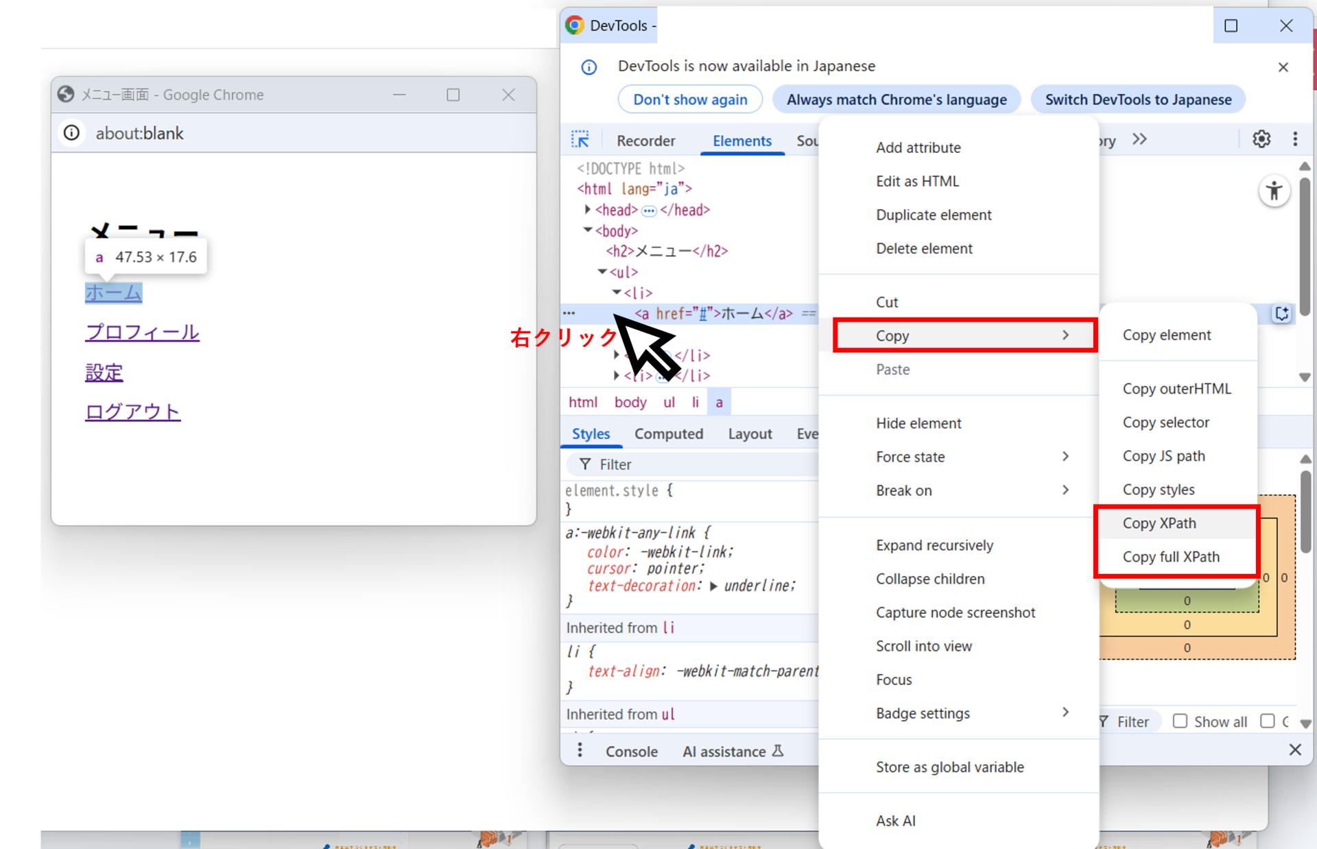 右クリック→「Copy」→「Copy XPath」もしくは「Copy full XPath」をクリック