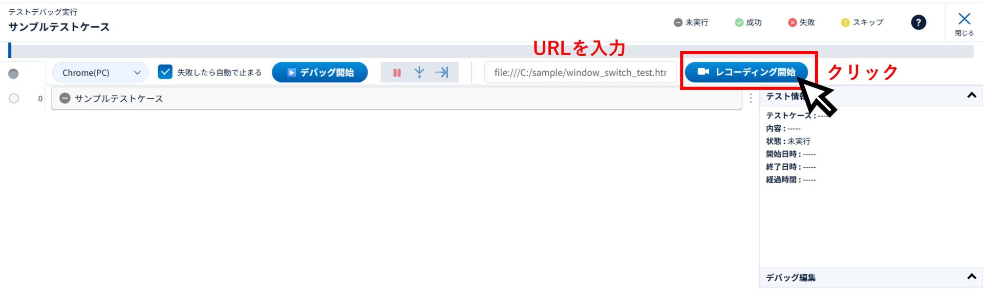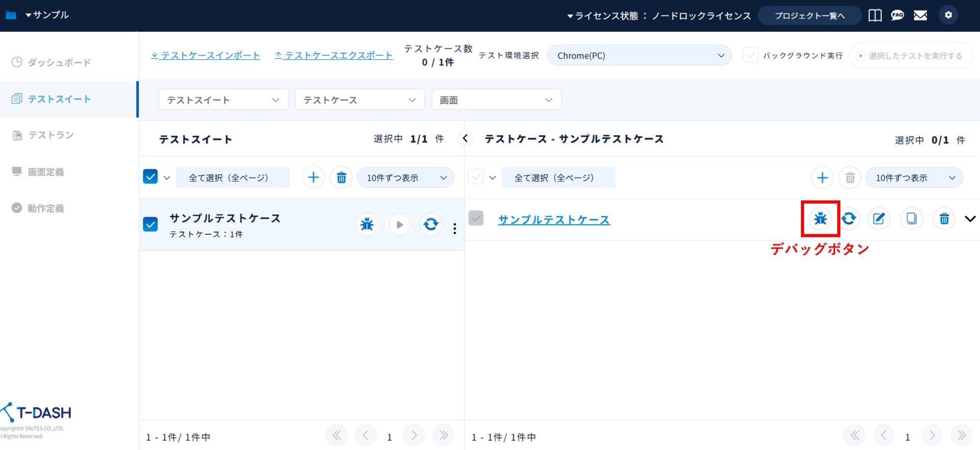 「テストスイート」タブからテストスイートとテストケースを作成し、 テストケースのデバッグボタンをクリックします。