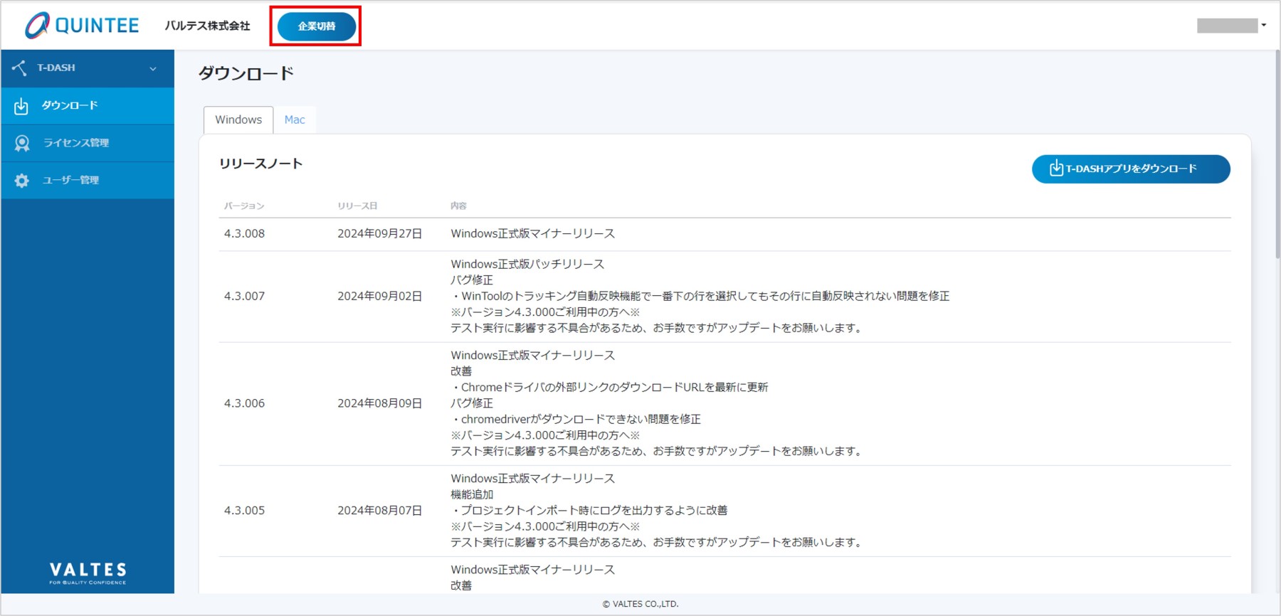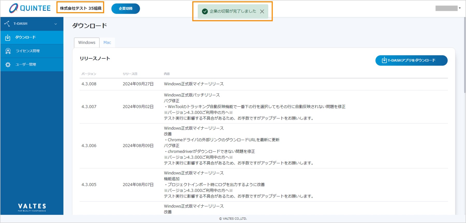 また、切り替えた企業にてT-DASHを操作することができます。