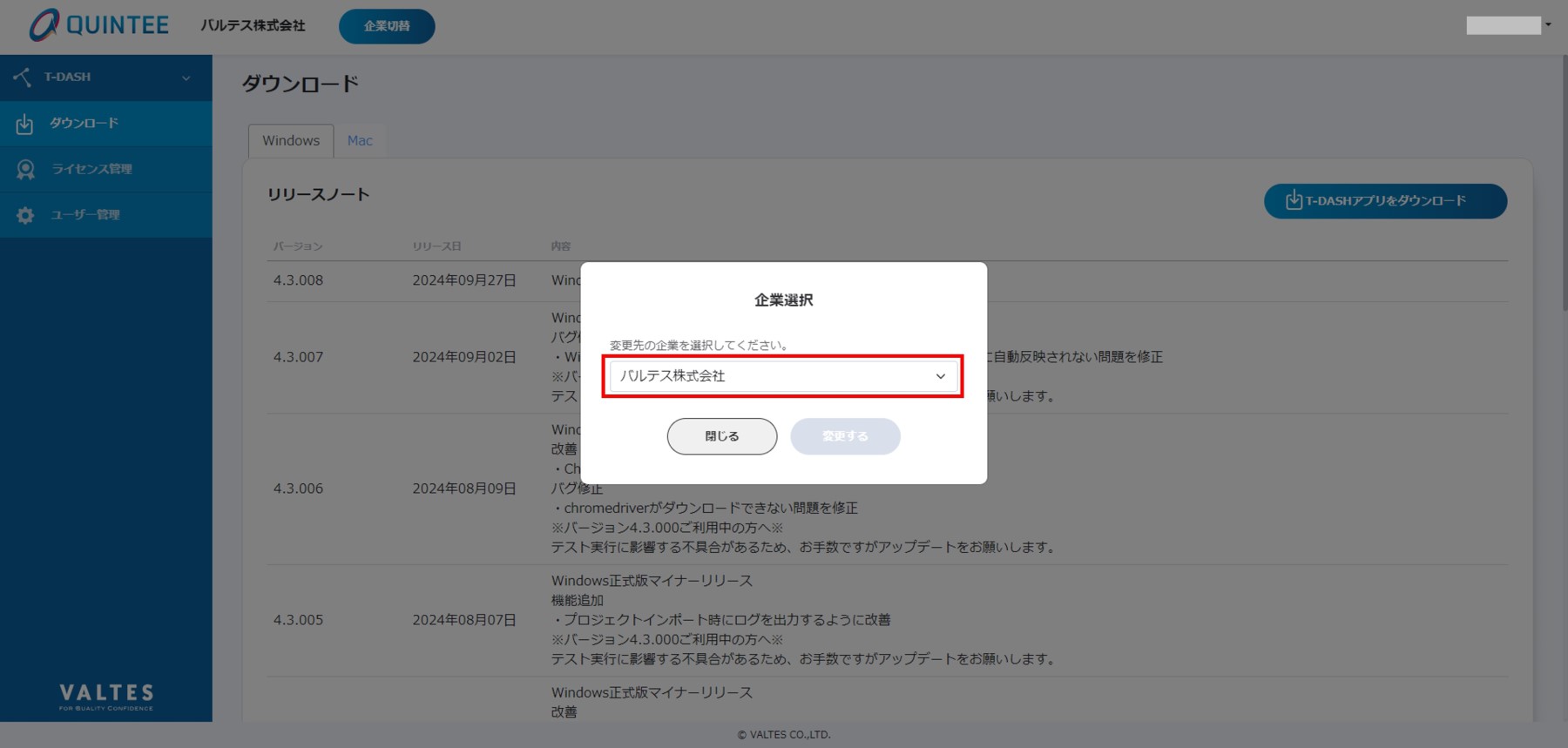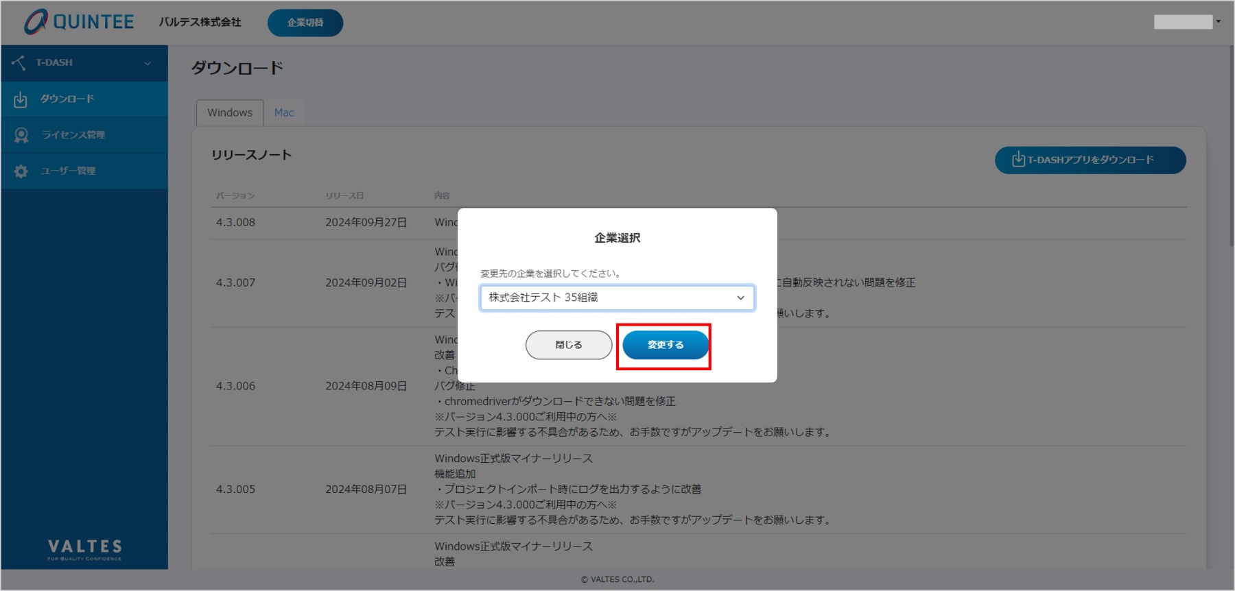 - 切替後の企業でT-DASHを利用したい場合、T-DASH上で切替前の企業でライセンスの解除が必要です。